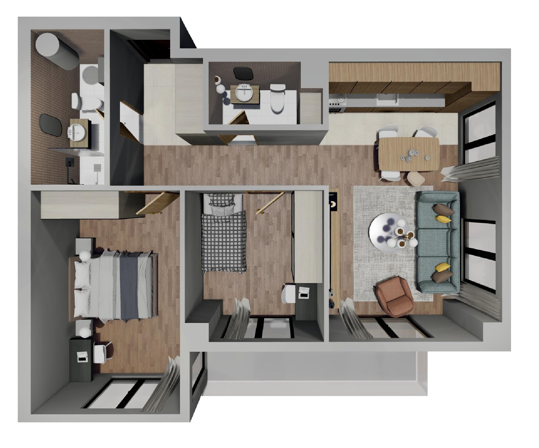 Стан бр. 1.03 Влезен хол 5.88 m² Кујна и трпезарија 5.08 m² Дневен престој 18.48 m² Тоалет 2.55 m² Бања 4.56 m² Спална соба 14.26 m² Спална соба 7.24 m² Тераса 8.81 m² вкупна квадратура 66.25 m² Резервирај термин Резервирај термин