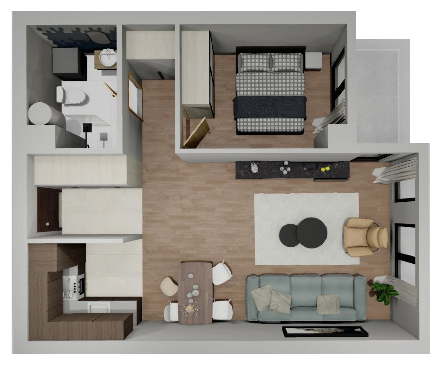 Стан бр. 5.38 Влезен хол 3.45 m² Кујна 4.00 m² Дневен престој 27.0 m² Бања 4.22 m² Спална соба 8.77 m² Тераса 3.04 m² вкупна квадратура 50.48 m² Резервирај термин Резервирај термин